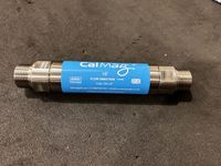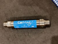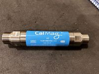 ‘Caleffi Ecal’ electrolytic anti-scale device with a stainless-steel filter and magnet, comprising of an in-line DZR brass body and a plastic housing. Maximum working pressure 16.0 bar. Maximum operating temperature 40°C.